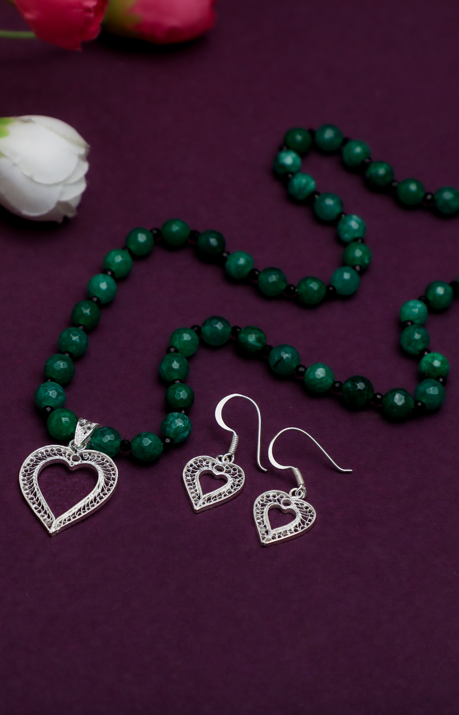 Heart Shaped Pendant Set with Green Beads