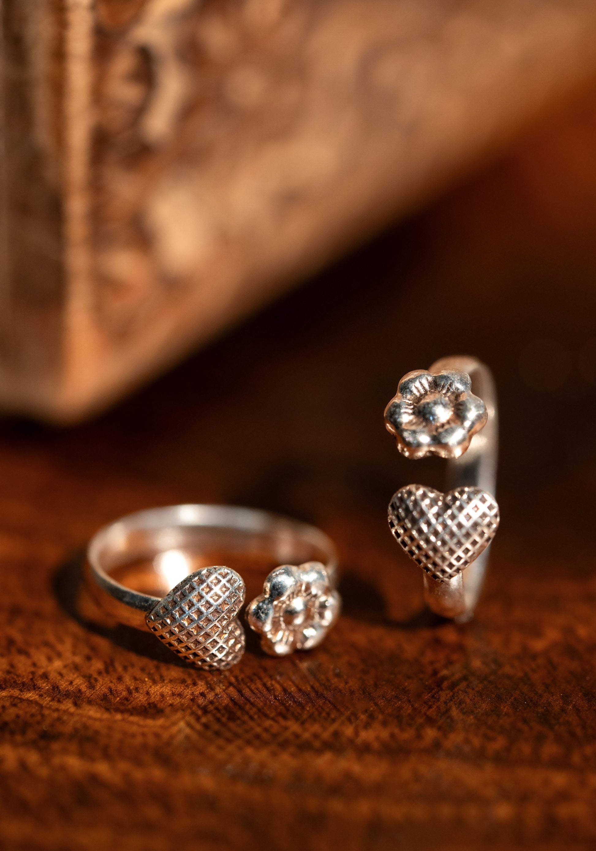 The Sumangali Silver Toe Ring is a graceful expression of love, beauty, and traditional femininity. Featuring a delicate heart and floral motif, this design symbolises emotional warmth and natural elegance, brought together through fine silver detailing and a balanced, timeless form.
