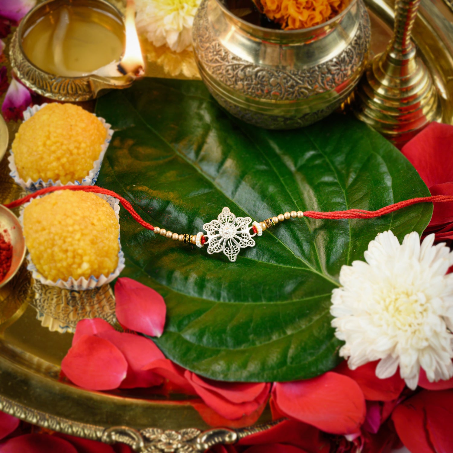 The ChandiSaaj Rakhi is a beautiful blend of tradition and elegance, featuring a red cotton thread adorned with golden and pearl-white microbeads, and highlighted by an intricately designed silver charm at the center, crafted from 92.5 sterling silver to symbolize purity, protection, and love, making it a meaningful expression of your bond with your brother, perfect for those who appreciate timeless craftsmanship and festive detailing, this rakhi offers a graceful touch with a classic color palette, turning Raksha Bandhan into a celebration filled with warmth, tradition, and a keepsake he’ll treasure long after the festivities end.