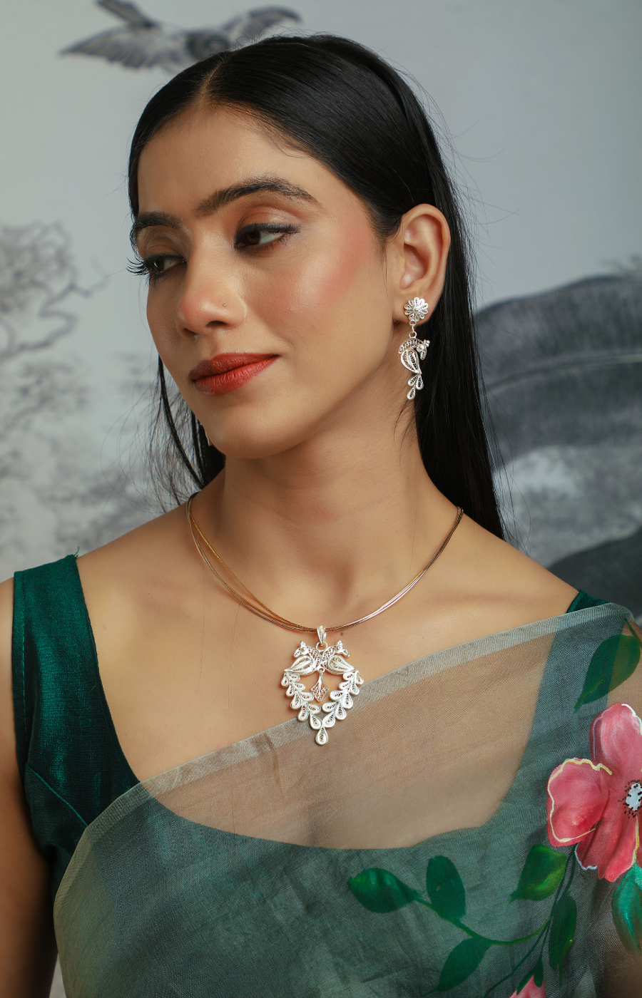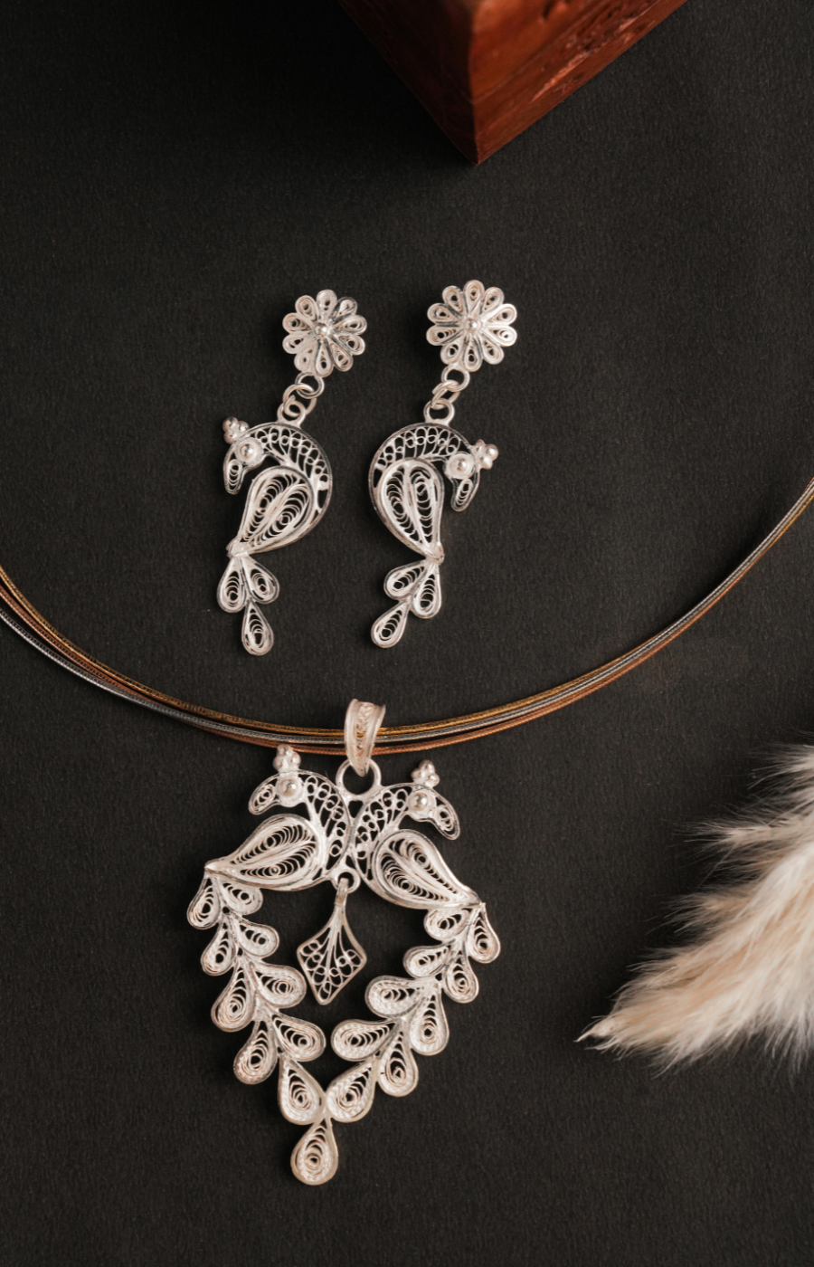 The Mayuri Pendant Set is a captivating ensemble inspired by the graceful allure of the peacock. The pendant and matching earrings are exquisitely handcrafted in fine Silver Filigree (Tarakasi), featuring intricate detailing that reflects elegance, movement, and timeless artistry. The peacock-inspired form symbolizes beauty and refinement, brought to life through delicate silver accents and skilled craftsmanship.
