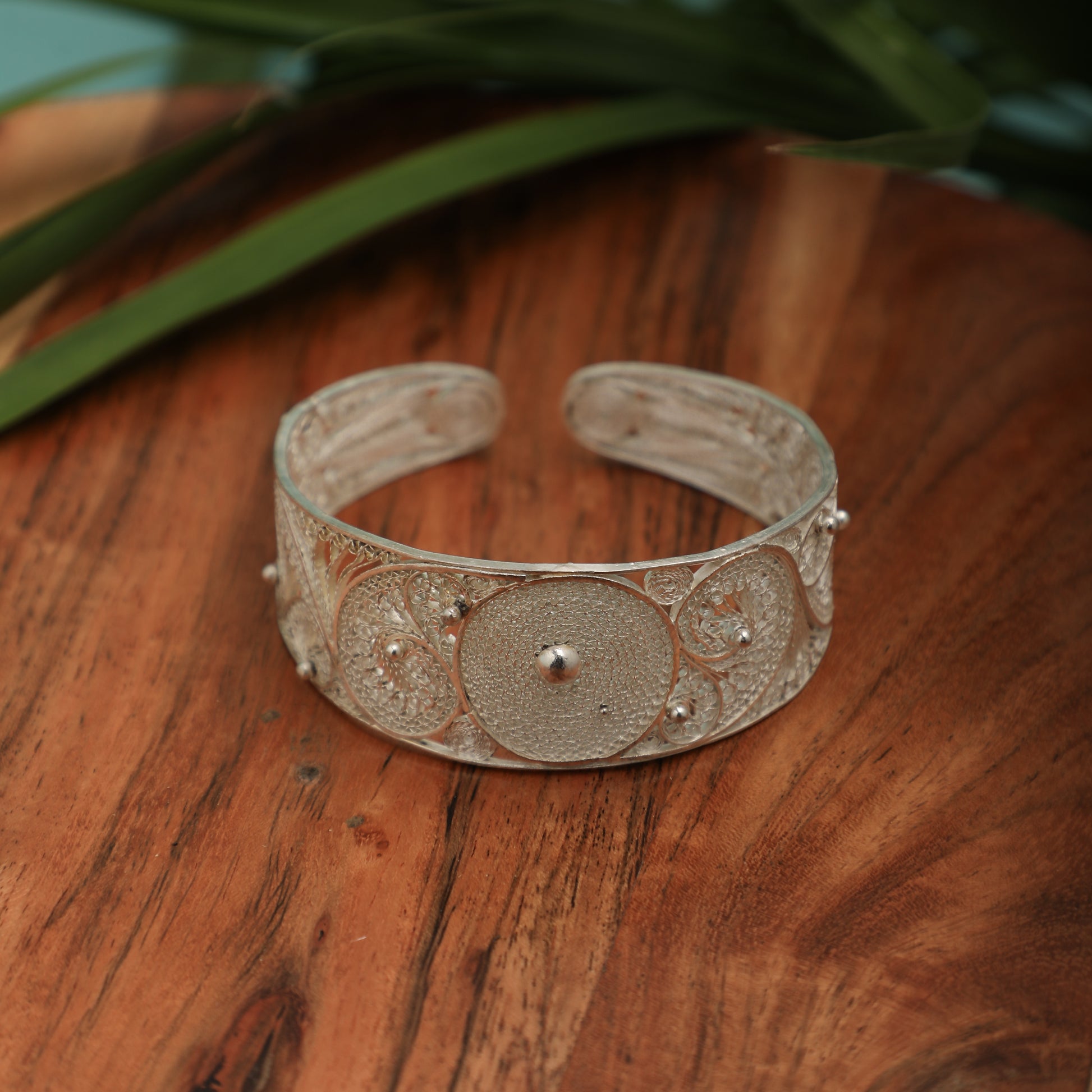 The Open-Cuff Filigree Silver Bangle is a refined expression of elegance and handcrafted artistry. Designed in an open-ended cuff style, this bangle features intricate silver filigree work that highlights delicate detailing and skilled craftsmanship. The airy filigree pattern gives the piece a light, graceful appearance while maintaining a strong traditional character.