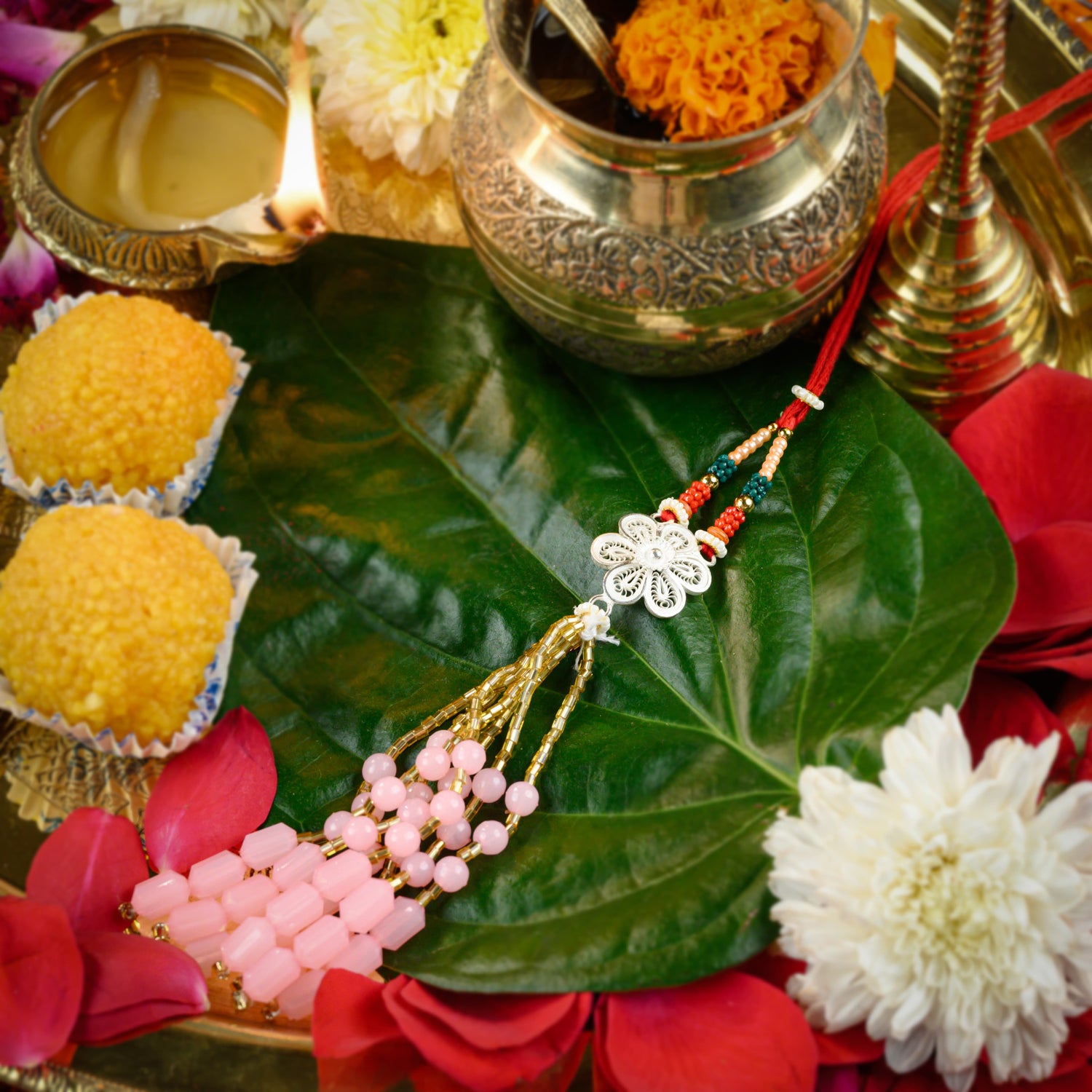 The Phoolan Rakhi is a beautifully crafted lumba rakhi that blends festive tradition with feminine elegance, featuring a classic red thread adorned with multicolored beads and a delicate 92.5 sterling silver charm, enhanced with hanging glass and microbeads in soft pink and golden shades for a graceful, modern touch, designed to be lightweight and gentle on the skin, this rakhi is perfect for sisters-in-law who appreciate vibrant detailing and meaningful craftsmanship, turning Raksha Bandhan into a celebration of love, warmth, and beauty with a rakhi that reflects both tradition and the unique charm of the bond you share.