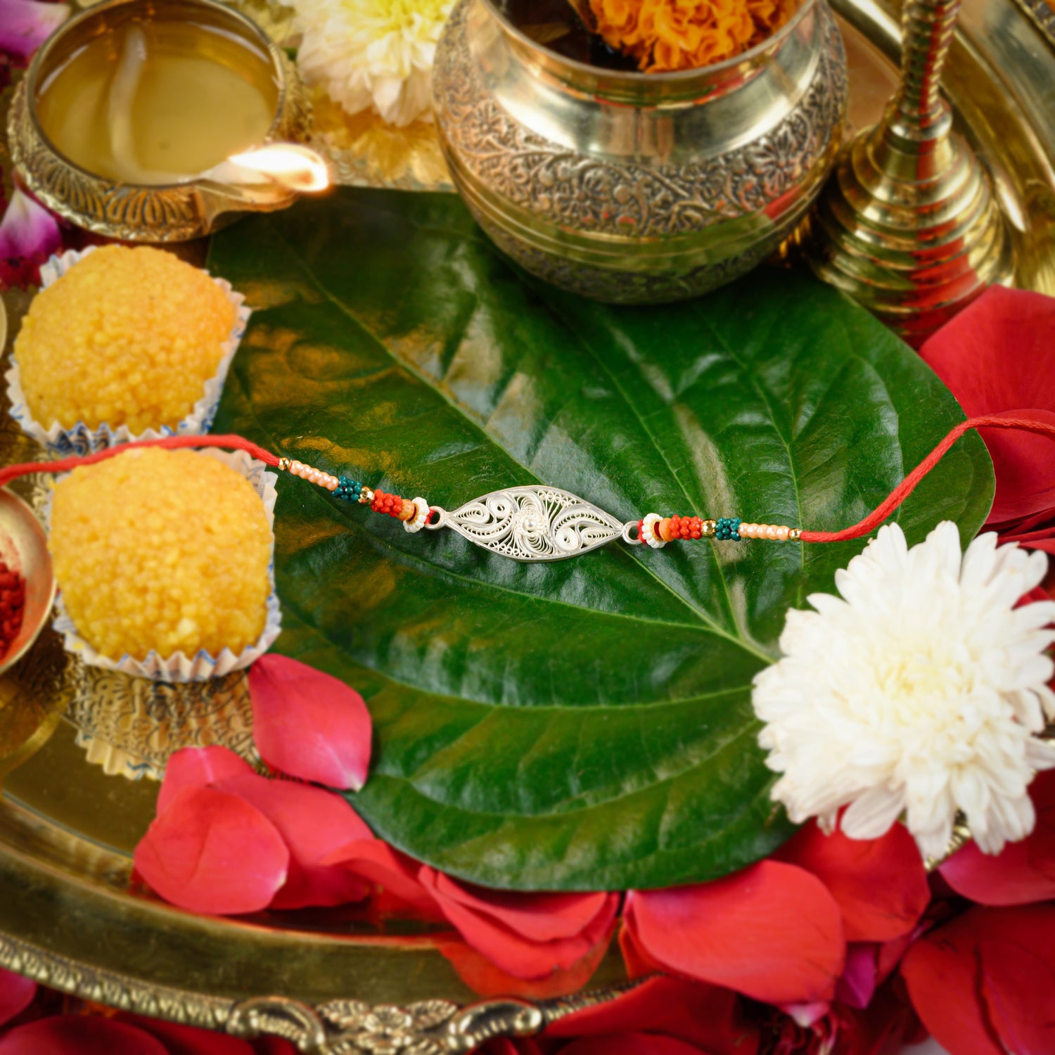 The Silvique Rakhi brings festive vibrance and timeless elegance together with its striking red cotton thread, embellished with golden and multi-colored microbeads, and crowned with a beautifully detailed 92.5 sterling silver charm at the center, representing the purity and strength of sibling love, making it a meaningful choice for Raksha Bandhan celebrations, ideal for brothers who appreciate colorful, artistic design paired with high-quality craftsmanship, offering a perfect balance of tradition and modern flair that turns a simple rakhi into a treasured keepsake of love, blessings, and togetherness that lasts far beyond the festivities.