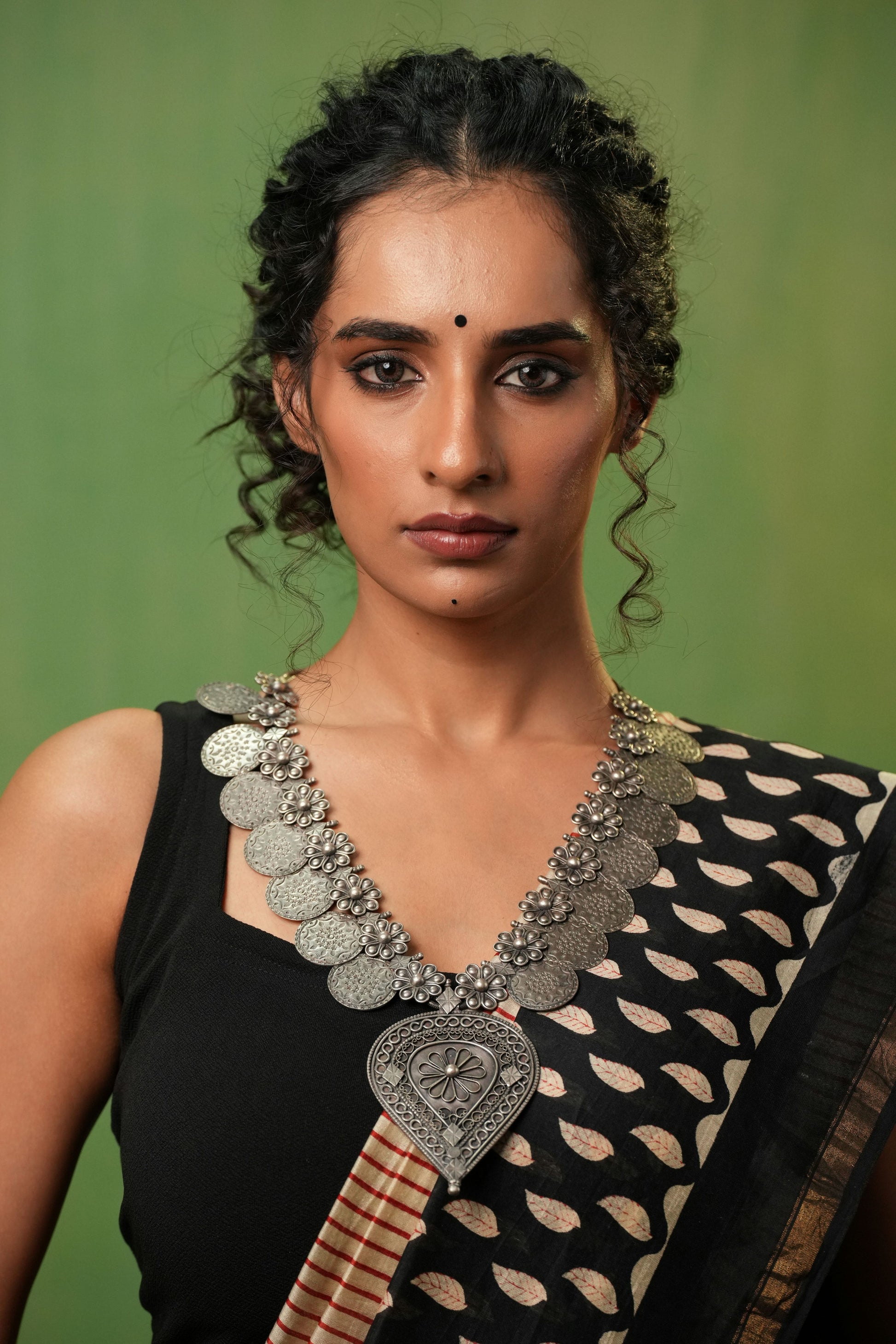 THE SHYLE TIP: Pair this necklace with handloom sarees, cotton silk drapes, or solid contemporary outfits to let the engraved discs and floral detailing take center stage. It also works beautifully with Indo-western looks for an artistic statement.