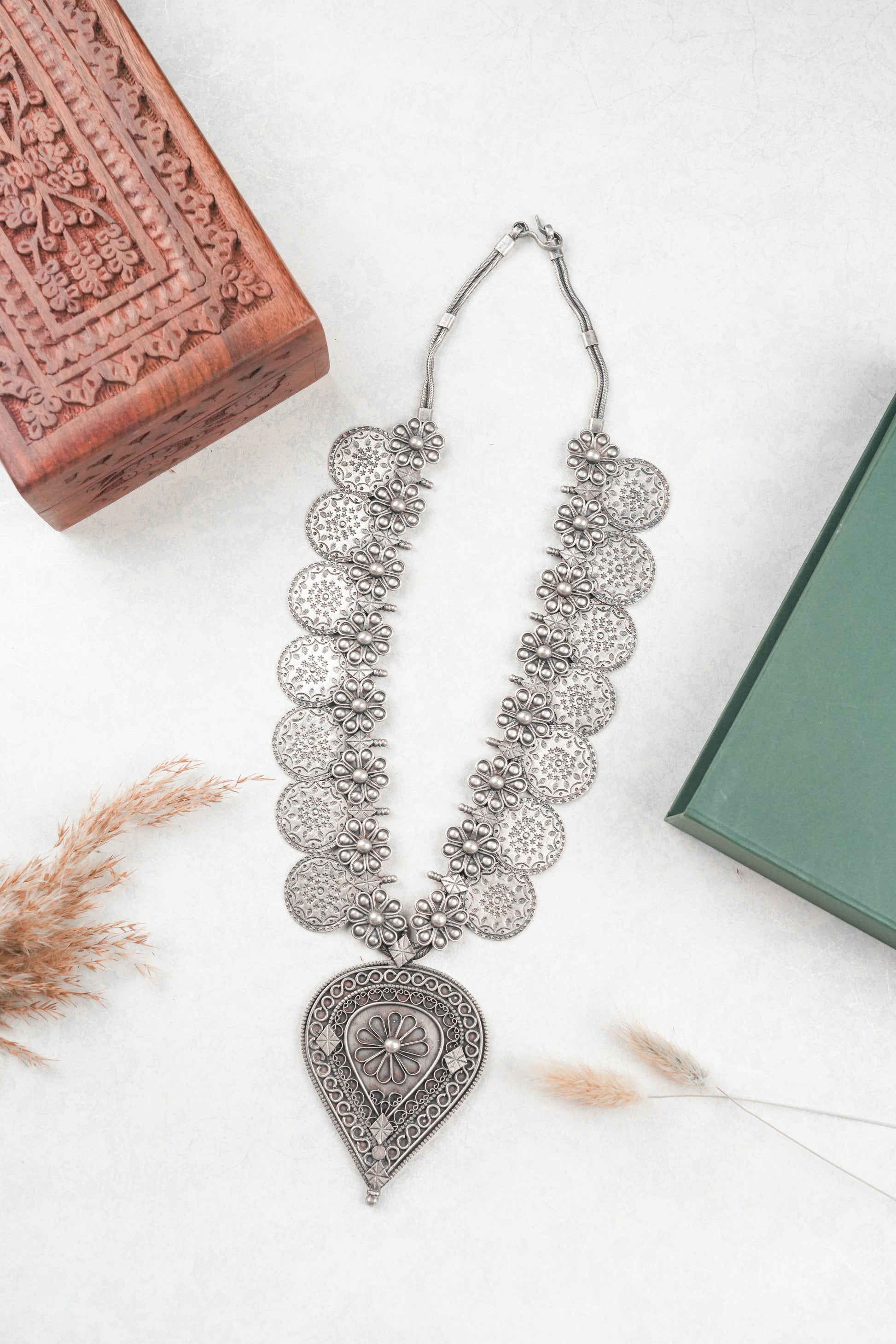 The Vintage Disc Flower Necklace is a striking oxidized silver statement piece that celebrates traditional artistry and handcrafted excellence. The chain is designed with an alternating arrangement of intricately engraved circular discs and raised floral motifs, creating a richly textured and visually captivating composition. Each disc is detailed with filigree-inspired patterns, while the floral clusters add depth, dimension, and an elegant handcrafted charm.